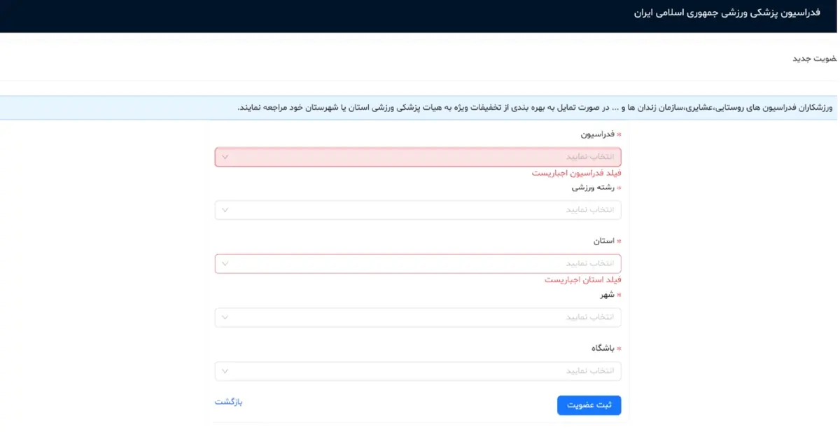 6. انتخاب رشته ورزشی و باشگاه: در بخش عضویت جدید، فدراسیون را «کوهنوردی و صعودهای ورزشی» انتخاب کرده و رشته ورزشی و باشگاه خود را انتخاب نمایید.