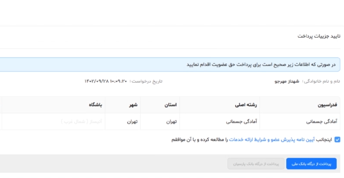 9. پرداخت هزینه: در حال حاضر هزینه ثبت نام بیمه ورزشی سالانه ۱۴۰ هزار تومان است.